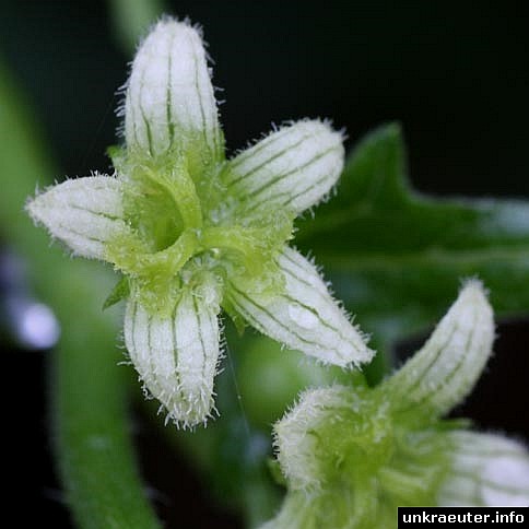 Weibliche Blüten 10 - 12 mm Durchmesser, mit dreiteiligen, behaarten Griffeln, im Schlund mit dicht behaarten